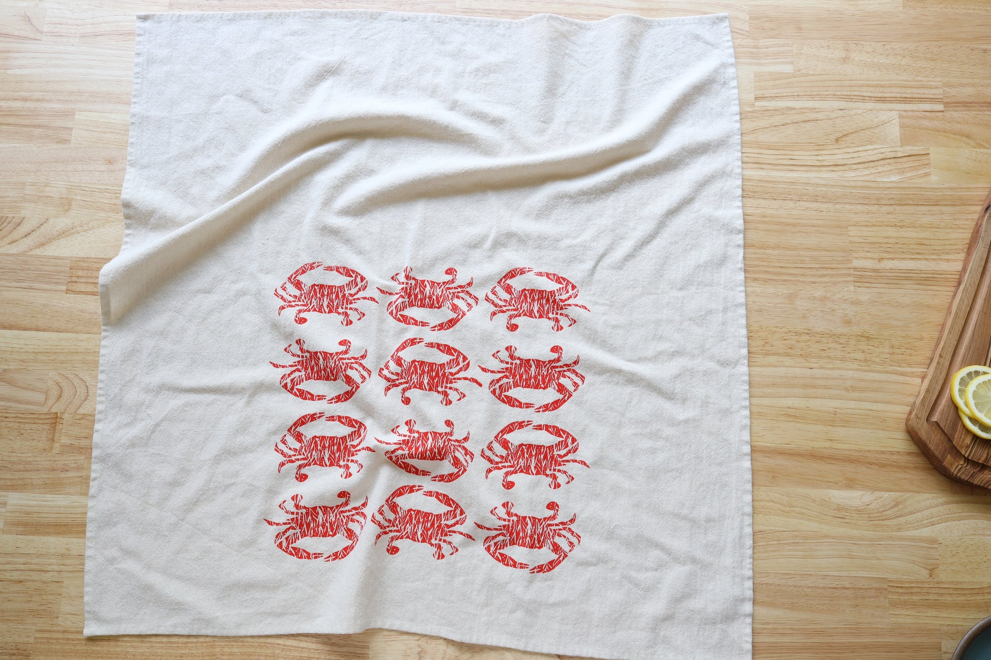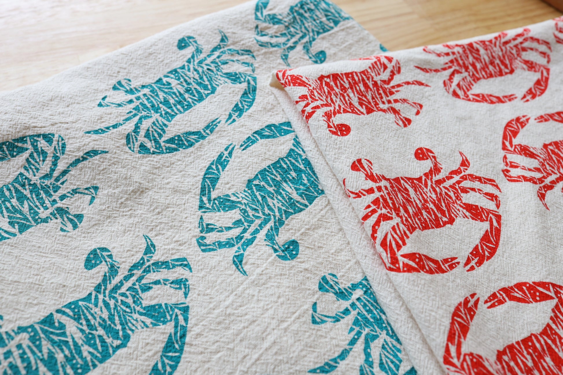 Handprinted with our blue crab illustration in The High Fiber studio in Asheville, North Carolina using water based, environmentally friendly, non toxic, and permanent inks.