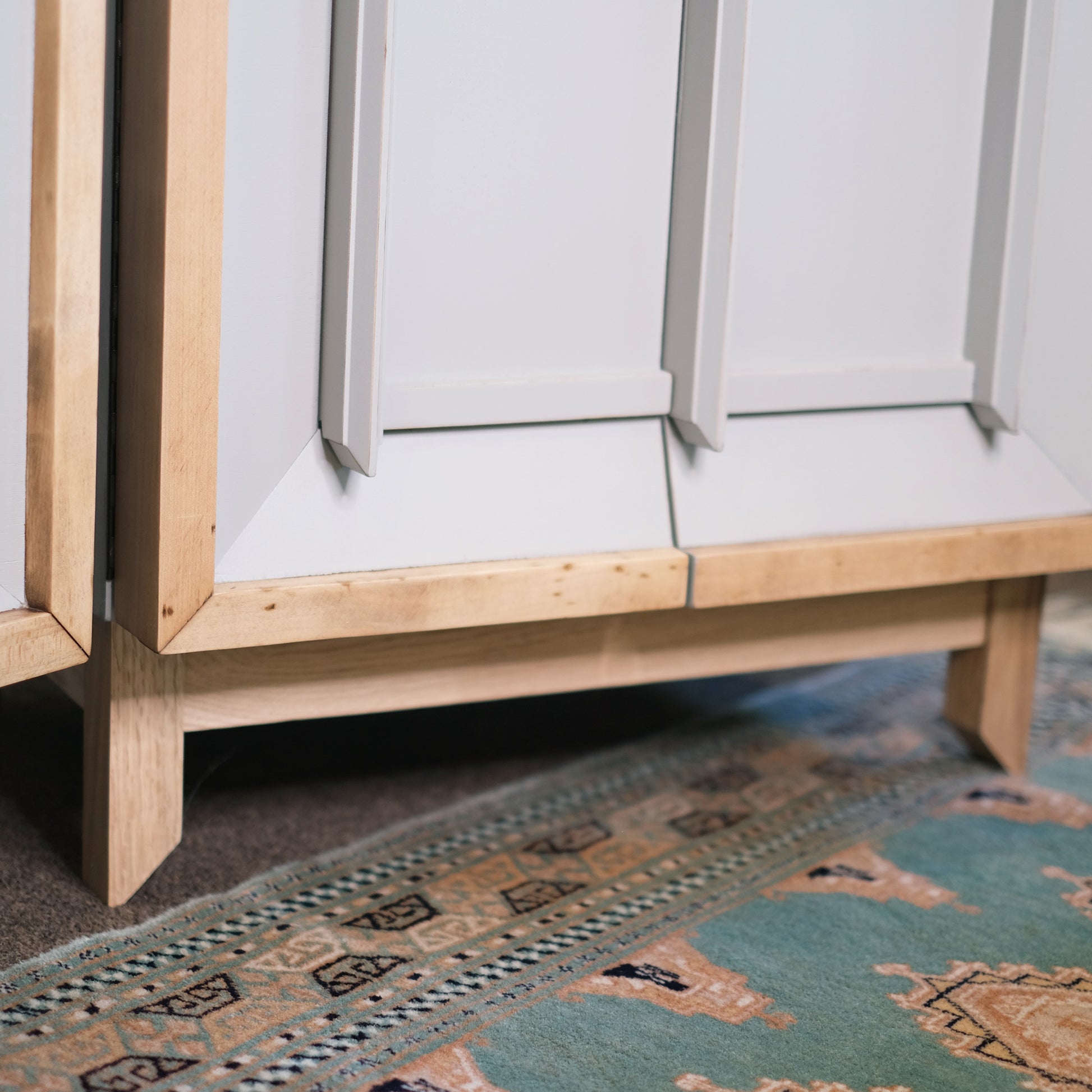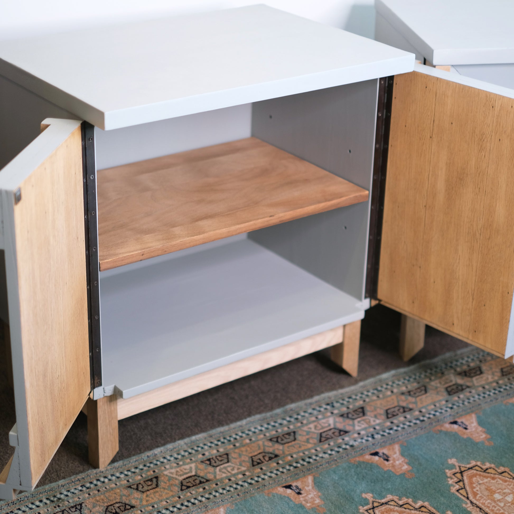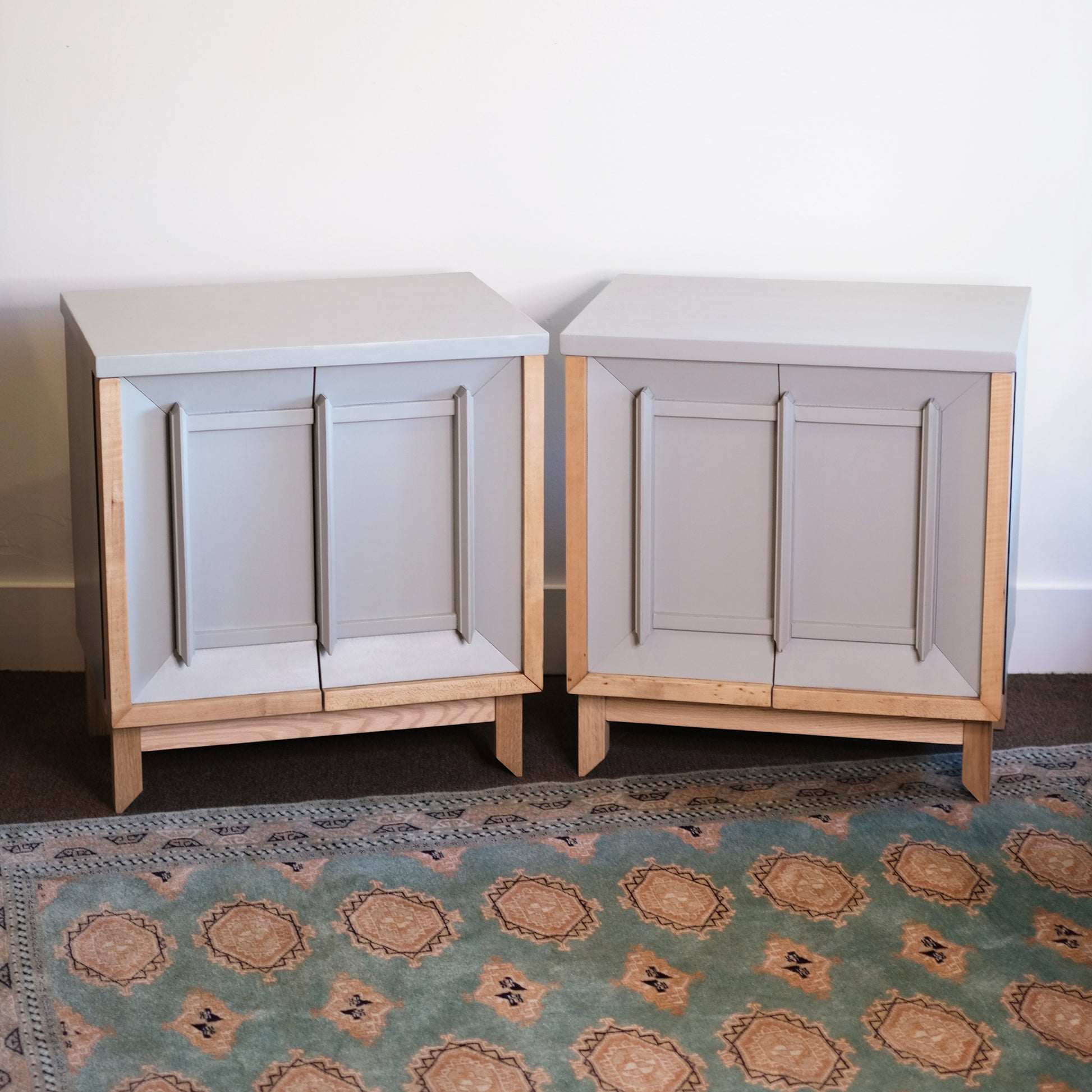 This matching set is bright and modern. They are painted in a clean iconic gray and have new natural oak legs.
